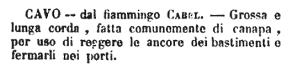 | Cavo - Dal fiammingo Cabel. Grossa e lunga corda, fatta comunemente di canapa, per uso di reggere le ancore dei bastimenti e fermarli nei porti. [immagine] |