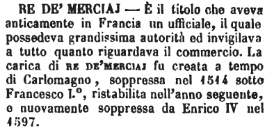 | Re de’ merciaj - È il titolo che aveva anticamente in Francia un ufficiale, il quale possedeva grandissima autorità ed invigilava a tutto quanto riguardava il commercio. La carica di re de' merciaj fu creata a tempo di Carlomagno, soppressa nel 1514 sotto Francesco I.°, ristabilita nell'anno seguente, e nuovamente soppressa da Enrico IV nel 1597. [immagine] |